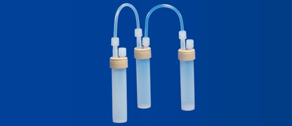 半導体製造工程などのクリーンルーム環境評価測定などに最適で、真空ポンプを使用して空気中に浮遊する微量の物質をインピンジャー内の液体に通過させることによって捕捉します。サンプリングトレインとして使用するため蓋には2つのポートが付属しています。